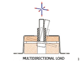 Новая виброопора Vibro-3D является одной из немногих антивибрационных опор, которые могут гасить вибрацию в трех плоскостях (х, у, z). Виброопора Vibro-3D предназначена для импульсных нагрузок в трех плоскостях, так что она способна поглотить высокие вертикальные или горизонтальные удары с минимальной опасностью разрушения